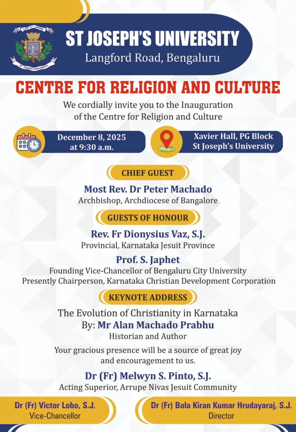 The Center for Religion and Culture (CRC) at St Joseph’s University, Bengaluru drives scholarship that documents and interprets the cultural, intellectual, and social contributions of Christianity to Karnataka and India. Through rigorous research, academic programs, publications, and public engagement, CRC strengthens interreligious dialogue and fosters deeper cultural understanding.